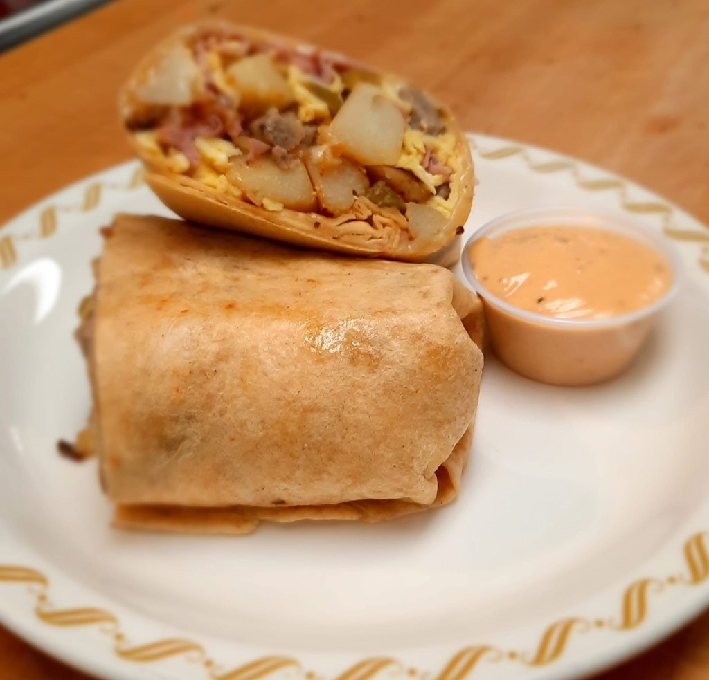 Peppers, Onions, Broccoli, Ham, Bacon, Sausage, Home Friends, 2 Scrambled Eggs and Cheese